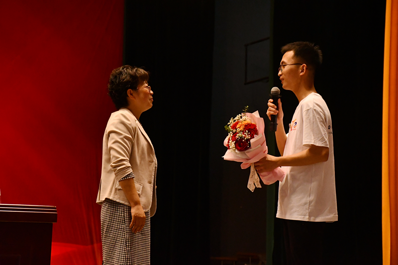 在互动环节,师生代表就让如何自己成为一个有智慧、有情怀的教育者,如何持续保持工作热情,做到干一行爱一行与王晓梅校长进行了交流。王晓梅耐心解答了在座师生的问题,并勉励在座的师生沿着党的二十大擘画的宏伟蓝图挺膺担当、砥砺奋斗,以奋斗的青春谱写新时代华章。 报告结束后,学生代表雷云杰(原青神中学毕业生)向王晓梅校长献花。