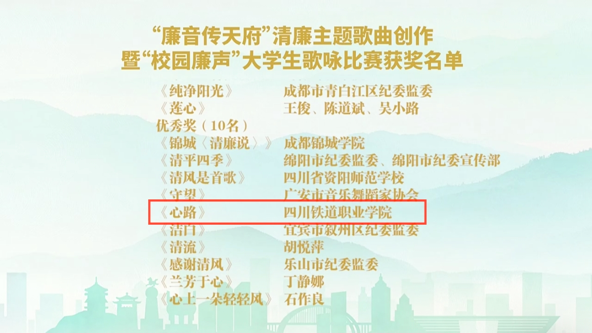 5月10日,在四川省第三届“510(我要廉)”廉洁文化宣传月活动启动仪式上,官方公布了由四川省纪委监委主办的“廉音传天府”清廉主题歌曲创作比赛获奖名单,我校教师郝曦与2019届校友唐石磊共同创作并演唱的歌曲《心路》在450余首参赛作品中脱颖而出,作为16首获奖歌曲之一,荣获优秀奖。