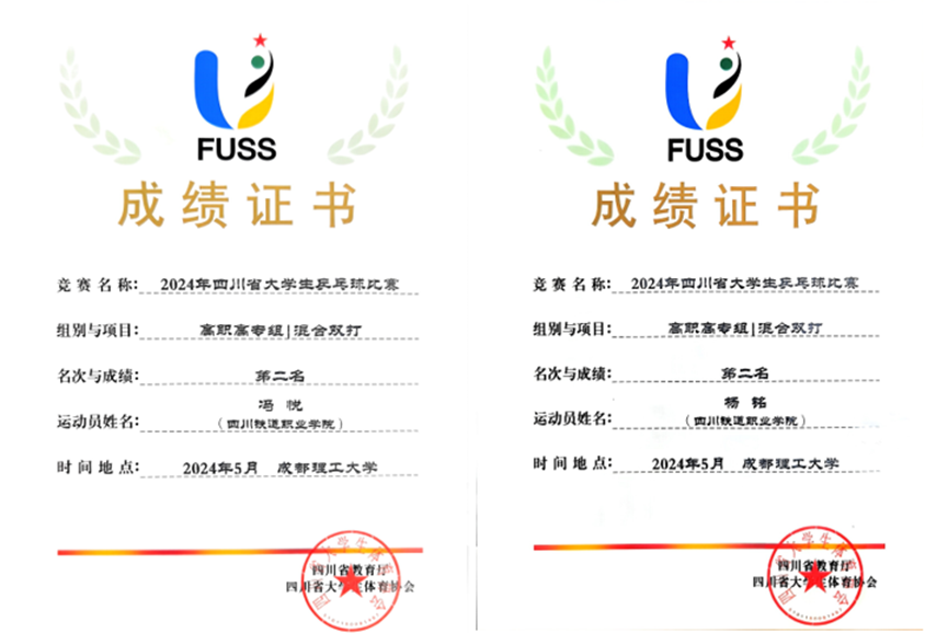 5月23日至5月26日,由四川省教育厅主办,四川省大学生体育协会、成都理工大学承办的2024年四川省大学生乒乓球锦标赛在成都城东体育公园二期乒乓球综合训练馆举行,我校首次组织代表队参赛,经过激烈的角逐,我校学生杨铭、冯悦在高职高专组混双项目比赛中喜获第二名。