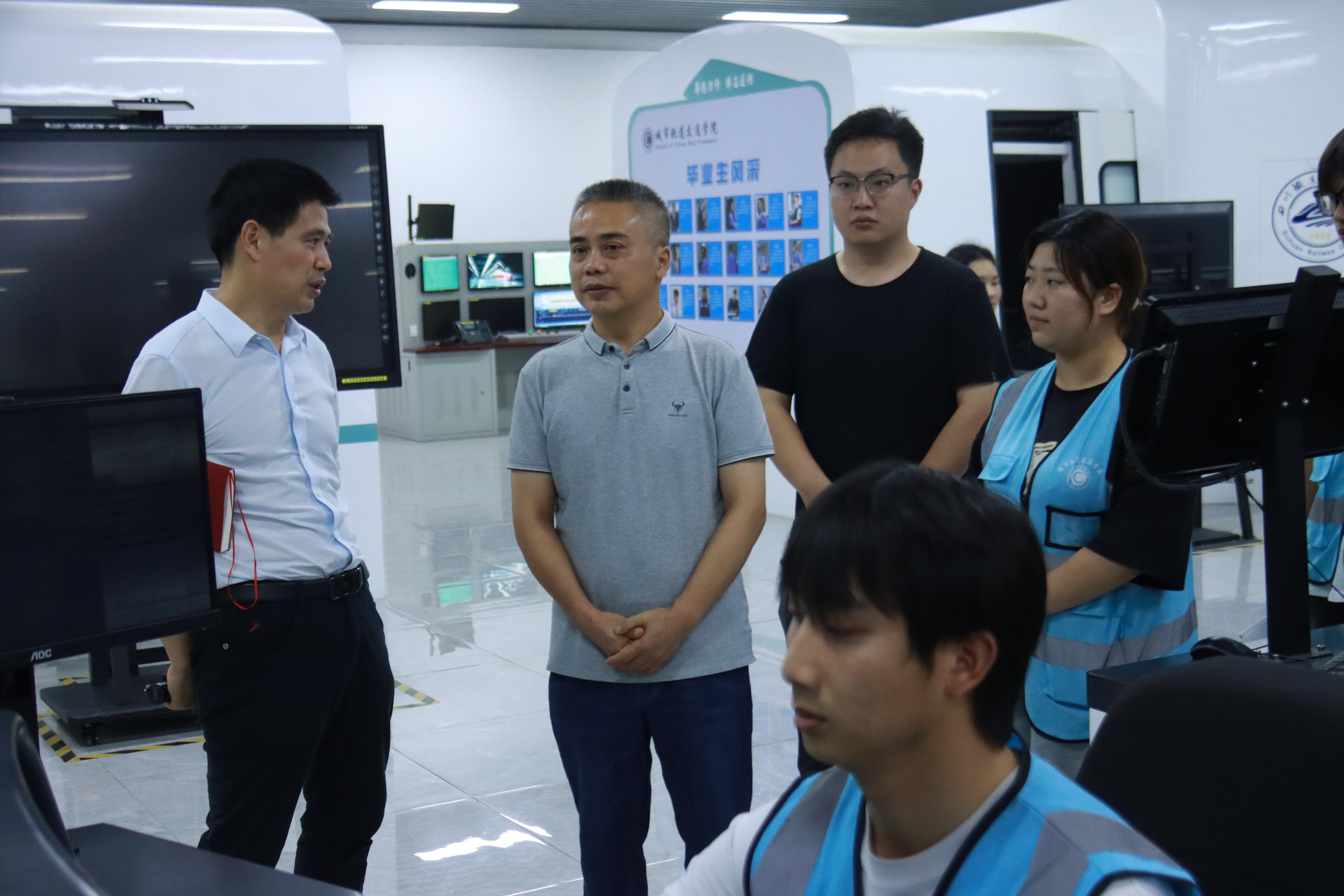 机车车辆学院院长龙明贵陪同江彤等校友参观驾驶数字化培训室、模拟驾驶实训室、车站控制实训室、地铁运营控制中心、复兴号高速动车模拟驾驶中心等实训场地,详细介绍了学校现况和近年来的发展历程。江彤在参观过程中,不断感叹母校的变化巨大、发展显著,为母校良好的办学条件和优异的办学成绩感到欣喜与自豪,自己将不负母校深情,为母校发展贡献力量。